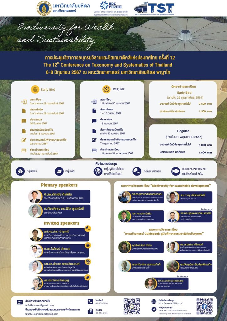 ขอเชิญชวนทุกท่านเข้าร่วมงานประชุมวิชาการอนุกรมวิธานและซิสเทมาติกส์แห่งประเทศไทย ครั้งที่ 12 ระหว่างวันที่ 6 – 8 มิถุนายน 2567 ณ คณะวิทยาศาสตร์ มหาวิทยาลัยมหิดล พญาไท