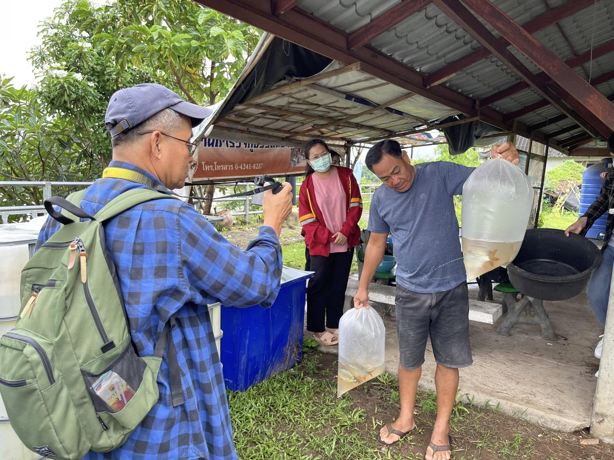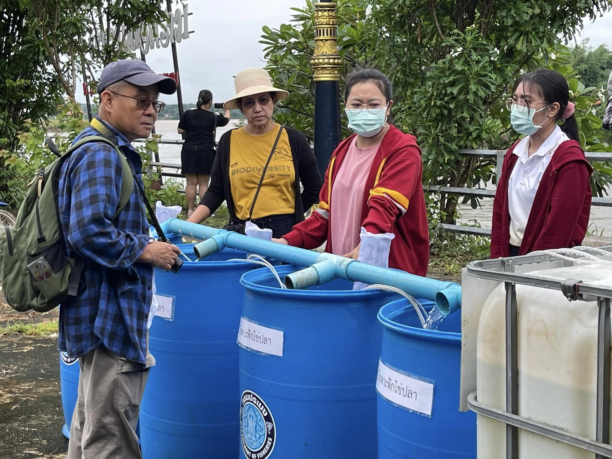 ศ. ดร.สมศักดิ์ ปัญหา, ผศ. ดร.รัชนี นามมาตย์ ร่วมลงพื้นที่กับชาวบ้าน เพื่อติดตั้งและทดสอบชุด Mobile hatchery ในโครงการการส่งเสริมการเพาะเลี้ยงสัตว์น้ำด้วยชุดเพาะฟักเคลื่อนที่ (Mobile hatchery) ในพื้นที่ลุ่มน้ำโขง วันที่ 17 กันยายน 2566 ณ ศาลาปากแม่น้ำสงคราม บ้านไชยบุรี ตำบลไชยบุรี อำเภอท่าอุเทน จังหวัดนครพนม