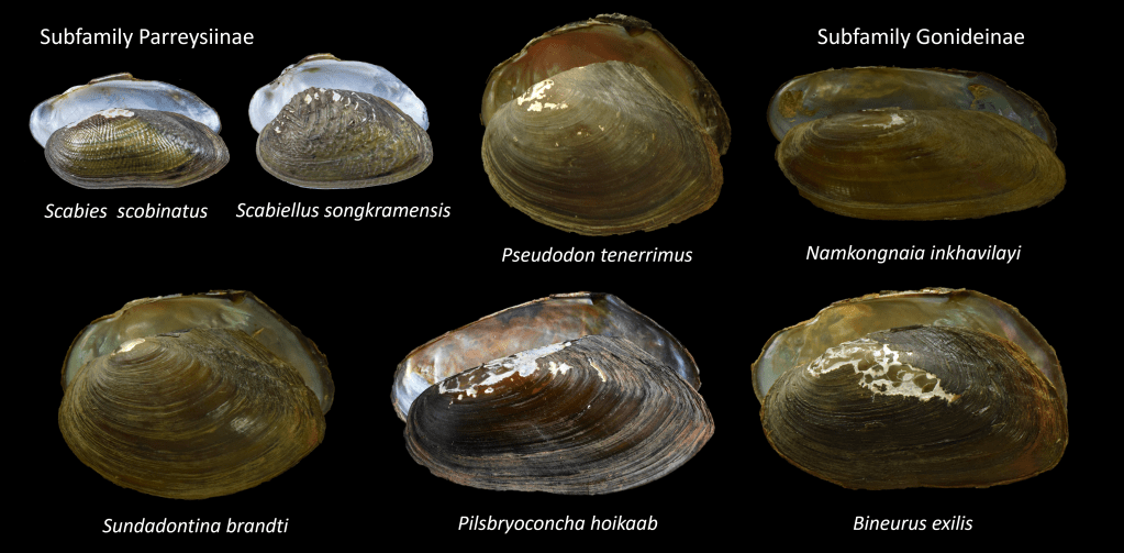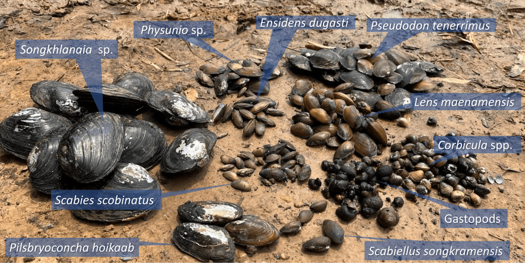 โครงการหอยน้ำจืดในลุ่มแม่น้ำสงครามภายใต้ภาวะ “แม่น้ำโขงป่วน” ภายใต้โครงการ Hub Mekong NRCT BDC โดย รศ.ดร.เอกชัย จิรัฏฐิติกุล และคณะ สำรวจหอยน้ำจืดครอบคลุมทุกลุ่มน้ำย่อยของลุ่มน้ำแม่น้ำสงคราม จำนวน 37 จุด พบหอยน้ำจืด 25 สกุล 31 สปีชีส์ แบ่งเป็นหอยสองฝา 12 ชนิด และหอยฝาเดียว 19 ชนิด ในจำนวนนี้มี 2 ชนิด ที่มีความน่าสนใจ ไม่สามารถจัดจำแนกได้ด้วยลักษณะทางสัณฐาน จึงได้ศึกษาในเชิงลึกพบความแตกต่างในระดับพันธุกรรมกับหอยชนิดอื่นในสกุลเดียวกัน ซึ่งกำลังอยู่ระหว่างการบรรยายลักษณะเป็นชนิดใหม่ของโลกต่อไป